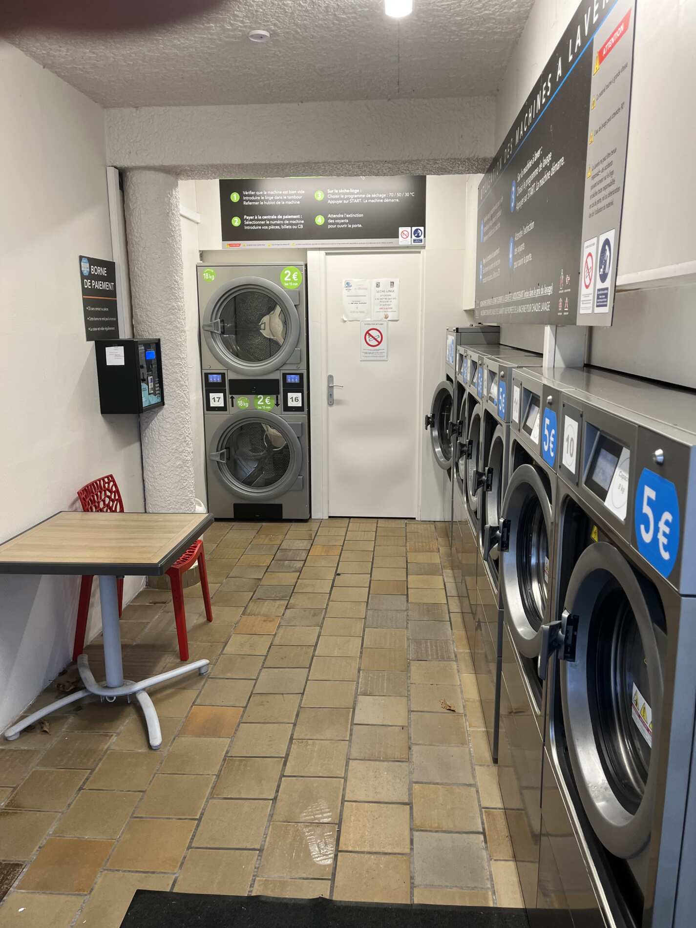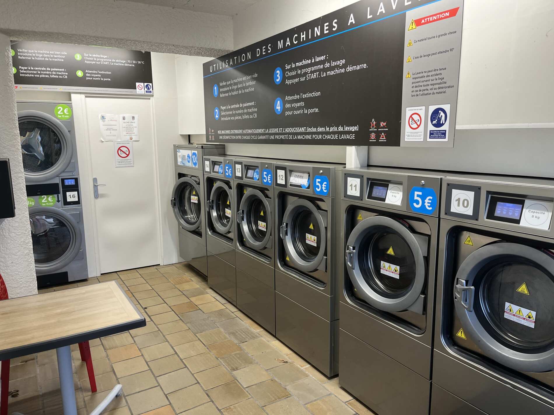 L’espace comprend 6 machines à laver et 2 sèche-linges, ainsi qu’un coin pour patienter confortablement.